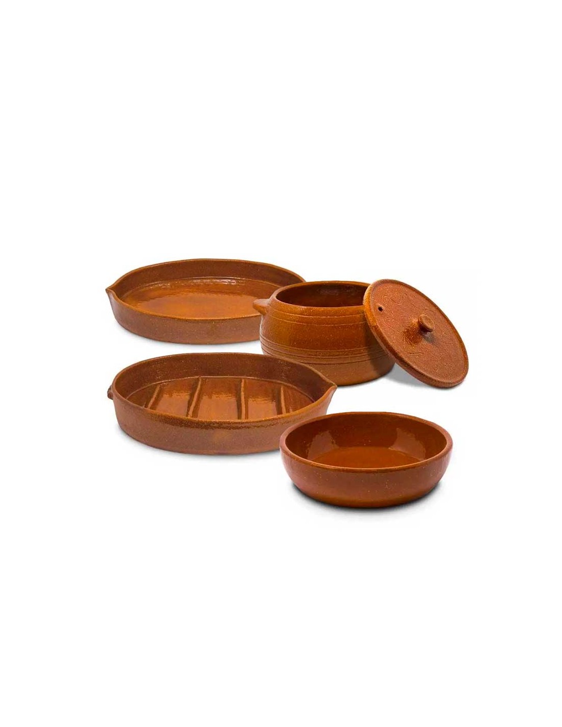 Se trata de un lote de 4 piezas (2 asadores + 1 puchero + 1 cazuela) con las medidas de utilización más comunes.